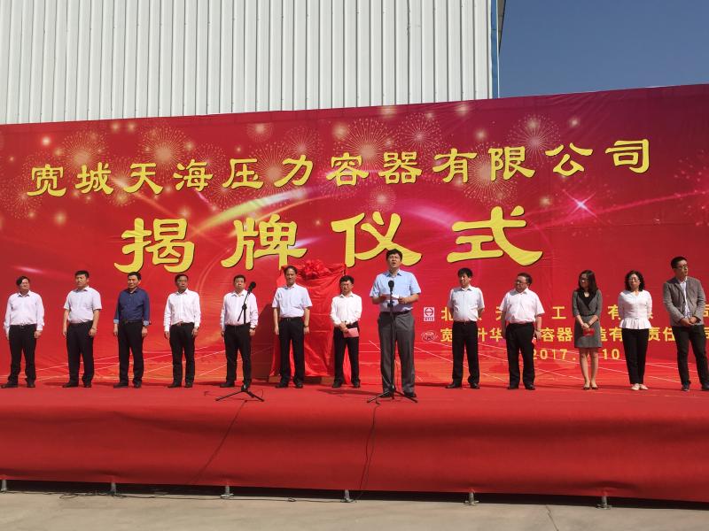 寬城天海壓力容器有限公司董事長袁文平在揭牌儀式上簡要介紹了項目建設(shè)情況。隨后,公司副總經(jīng)理王軍代表京城機(jī)電發(fā)表致辭。他在致辭中對寬城滿族自治縣良好的人文環(huán)境,豐富的礦產(chǎn)資源,堅實的工業(yè)基礎(chǔ),優(yōu)越的投資環(huán)境給予了高度評價。并對合作方——寬城升華壓力容器制造有限責(zé)任公司高效的管理機(jī)制、明顯的成本優(yōu)勢及廣闊的發(fā)展前景給予了充分肯定。他指出,寬城天海壓力容器有限公司的成立,是落實黨中央關(guān)于京津冀協(xié)同發(fā)展戰(zhàn)略,疏解非首都功能的一項重要戰(zhàn)略舉措。希望以此為契機(jī),依托各自的資源優(yōu)勢,加快項目建設(shè),積極開拓創(chuàng)新,完善合作機(jī)制,實現(xiàn)互利共贏。將寬城天海打造成為“全球高端氣瓶制造企業(yè)”,為京城機(jī)電和寬城縣的經(jīng)濟(jì)發(fā)展做出積極貢獻(xiàn)!